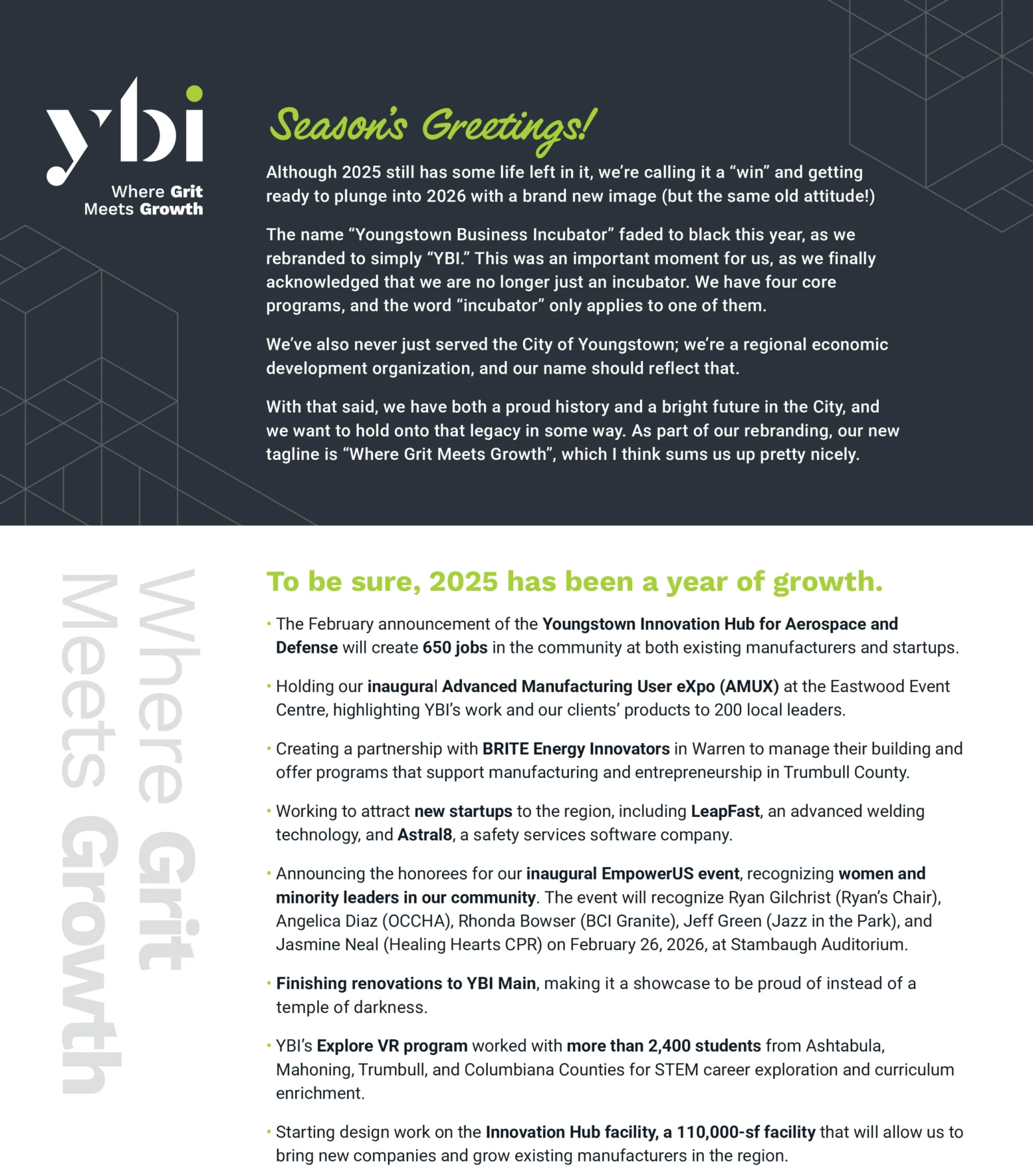 We’re on a mission to accelerate the Mahoning Valley’s economic development and provide sustainable employment opportunities by way of world-class businesses, innovative technologies and advanced manufacturing. Who’s with us?!